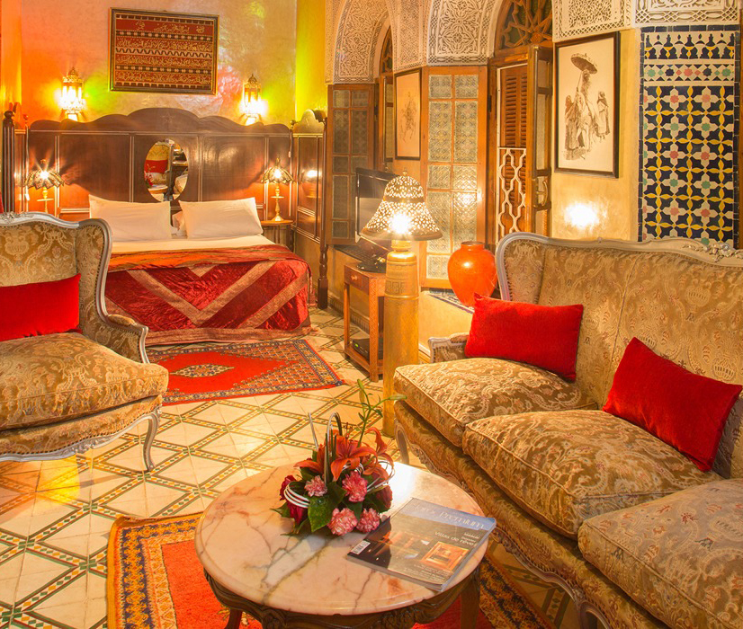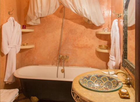 La Suite Souissi du Riad Dar El Kebira offre un espace généreux de 35 m², décoré dans un style arabo-andalou élégant et apaisant. Équipée d’un lit king-size, d’un coin salon, d’une salle de bains privative avec baignoire sur pied et de commodités modernes, elle promet un séjour luxueux et relaxant au cœur de la médina de Rabat. Fruits et eau vous attendent à votre arrivée, et un petit déjeuner marocain traditionnel est inclus chaque matin.