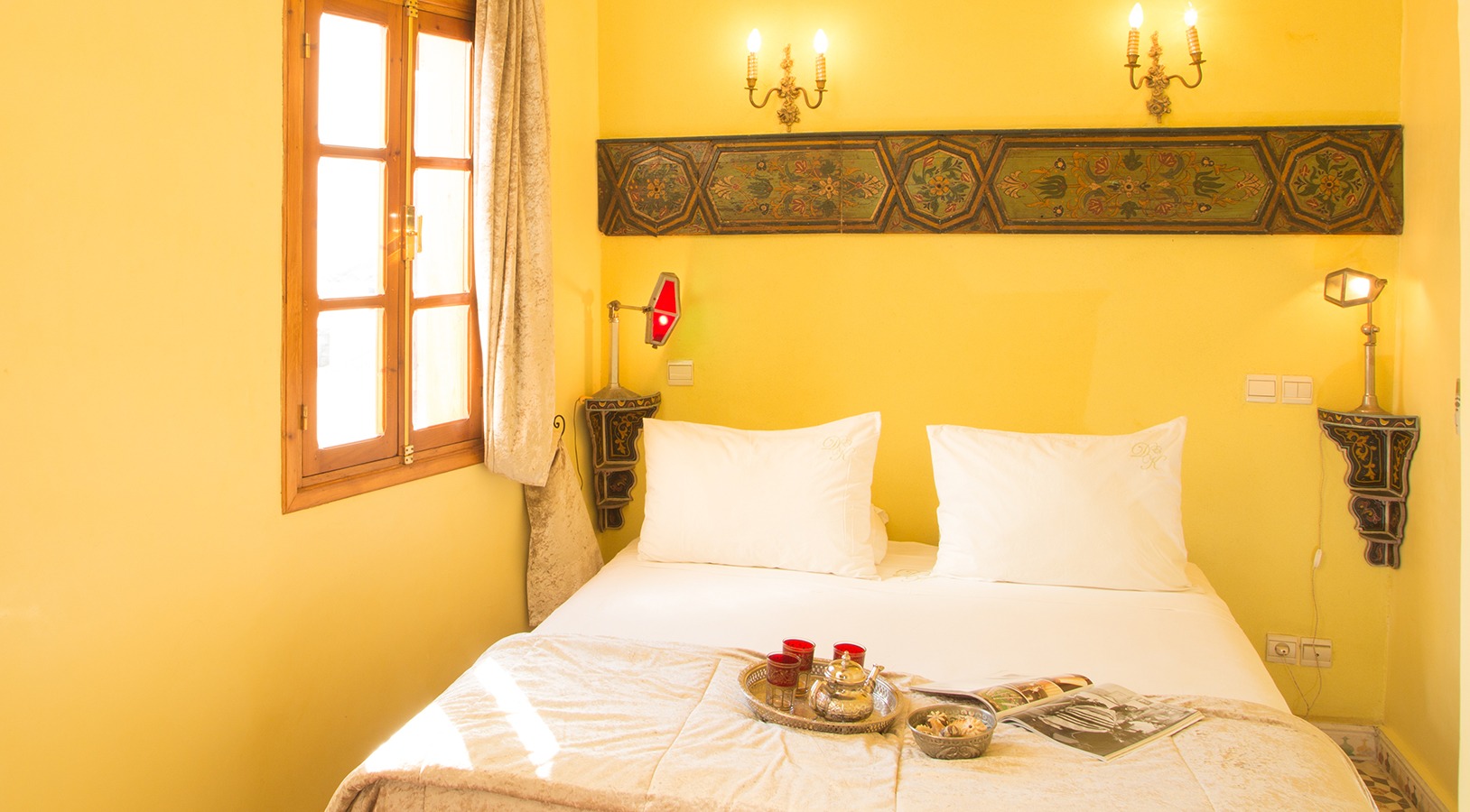 Décorée avec soin dans un style arabo-andalou, cette chambre allie charme traditionnel et confort moderne. Chaque détail est pensé pour offrir une atmosphère chaleureuse et raffinée, idéale pour un séjour reposant au cœur de la médina de Rabat.